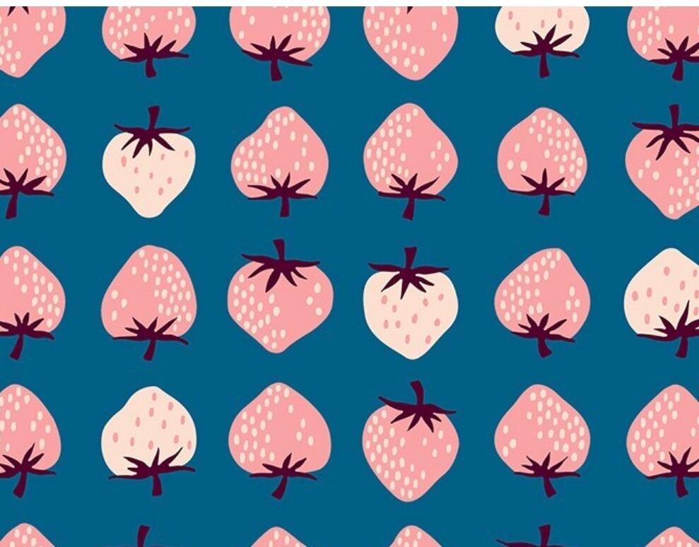 落ち着いたブルーにかわいいイチゴがならんだデザインです。