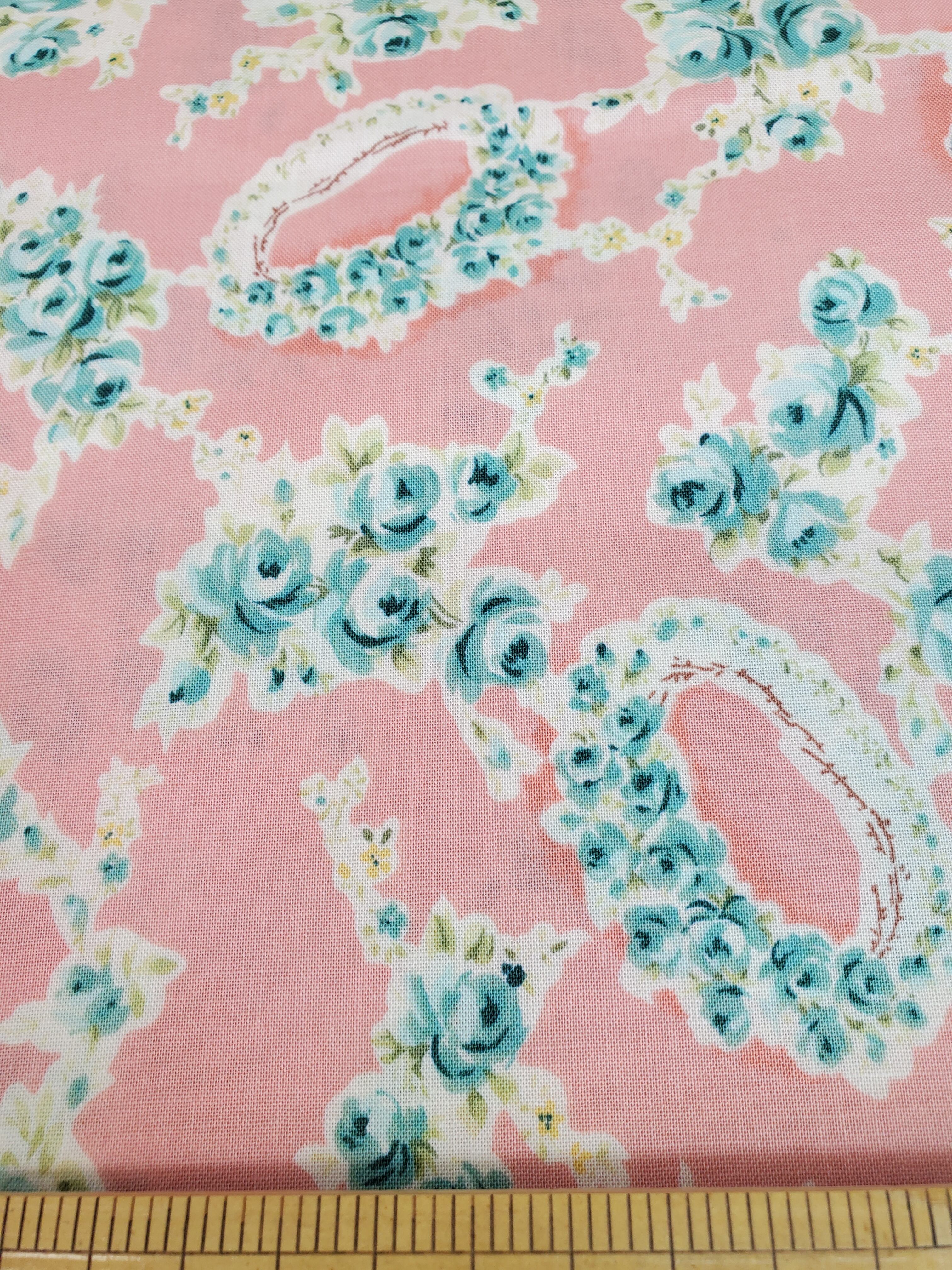 淡いピンクの生地にエメラルドグリーンのお花と花冠のデザイン