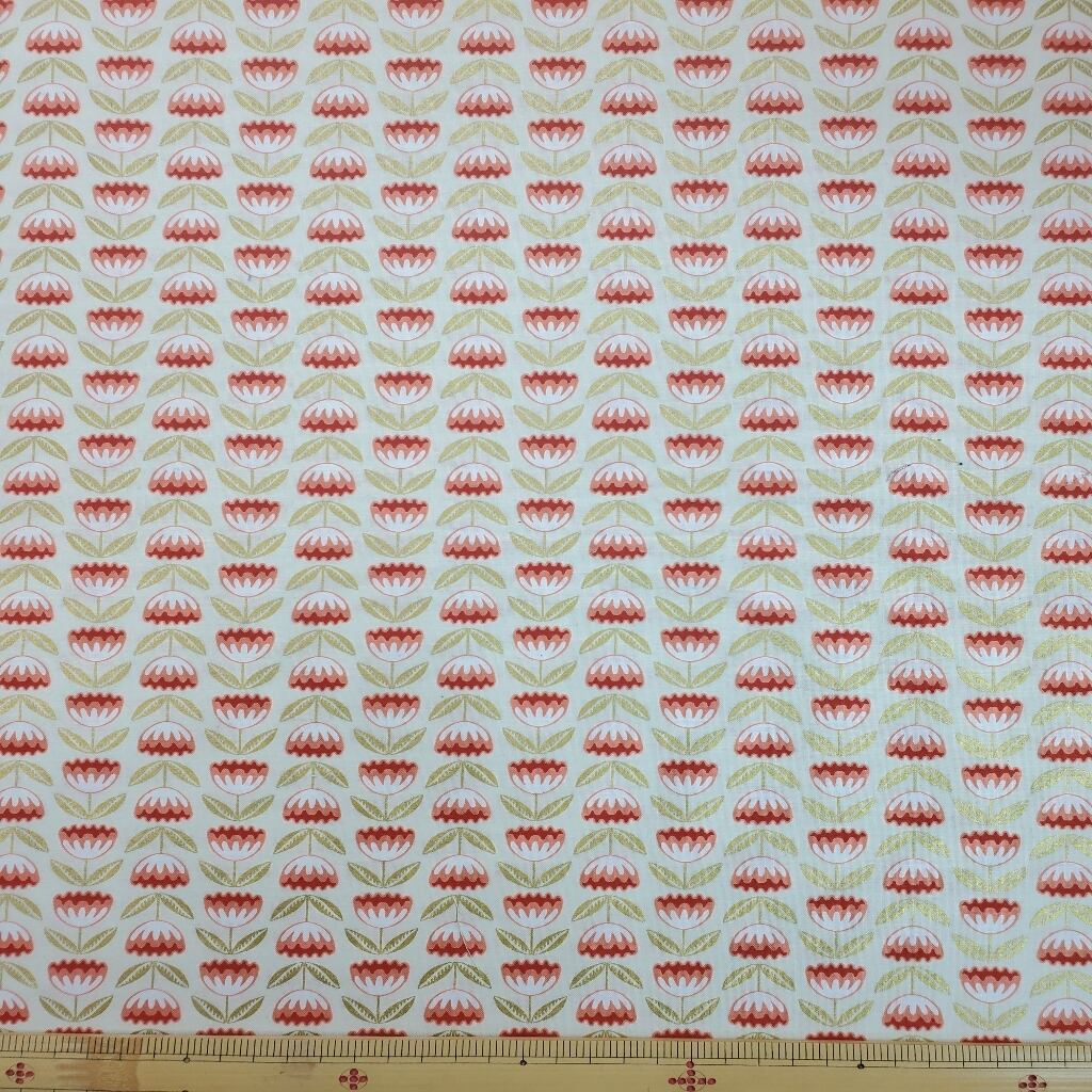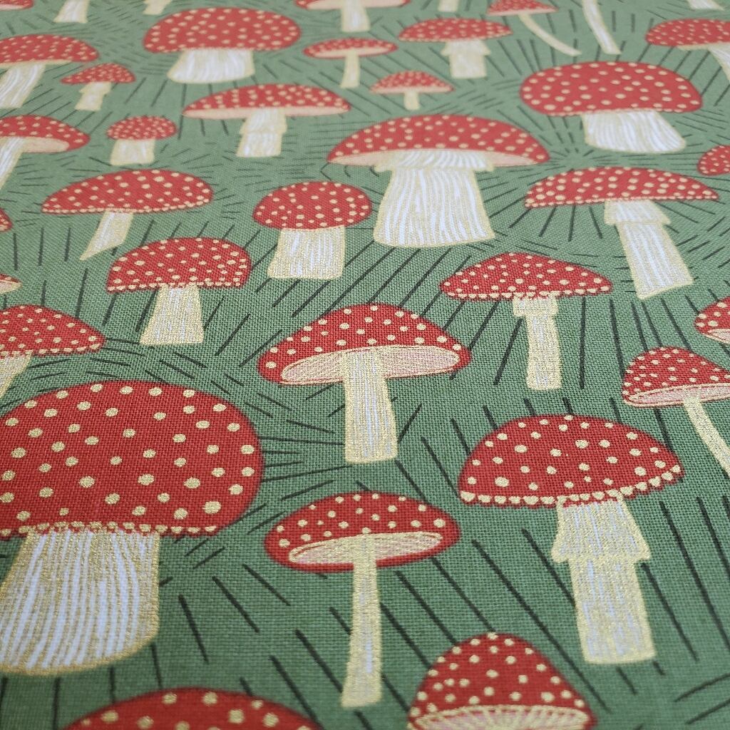 色々な形のキノコや、花にとまった蝶々、キナリの生地にゴールドの葉とかわいいお花のデザイン