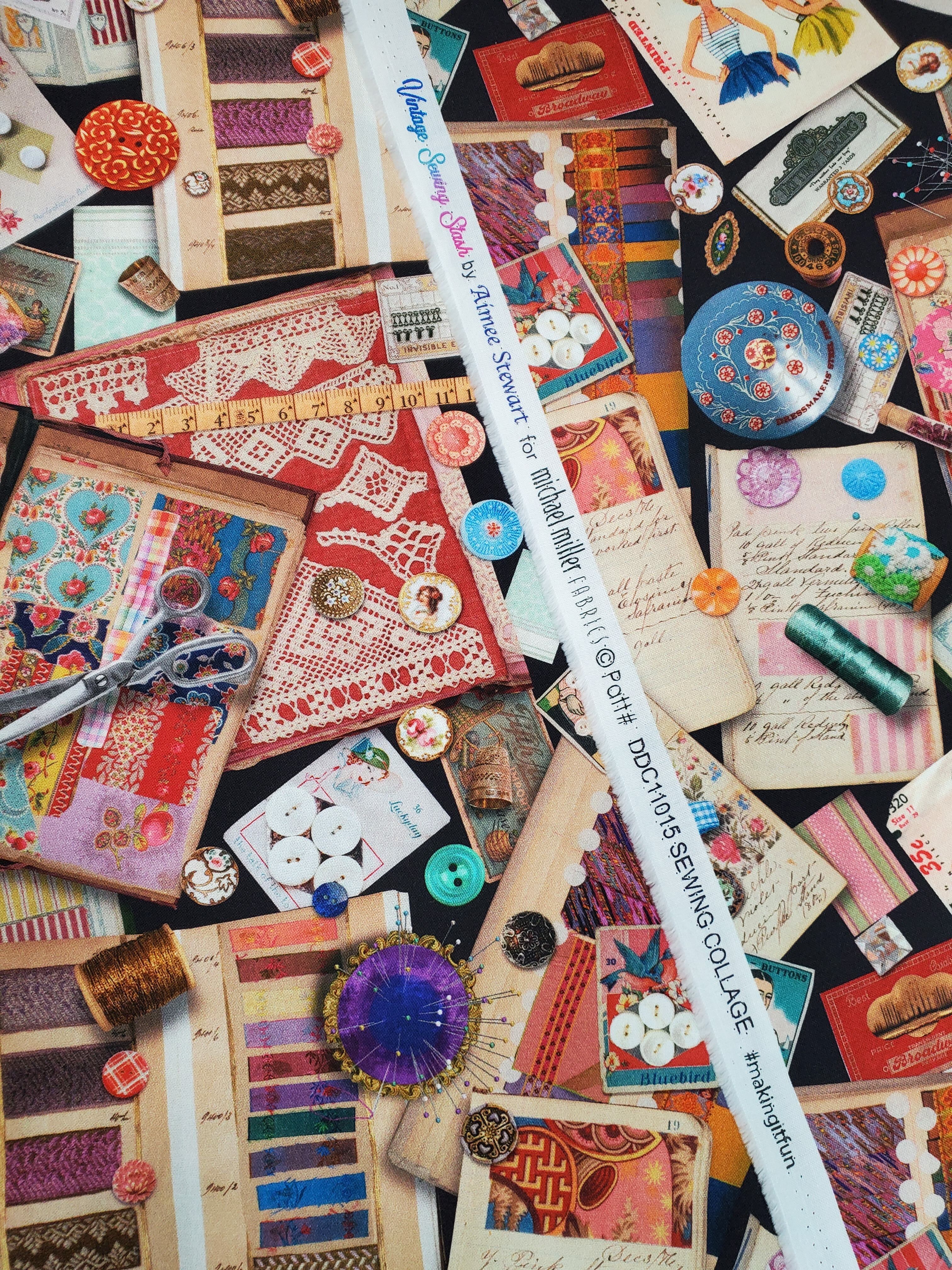 ソーイング道具のコラージュとアメリカンガールのデザイン